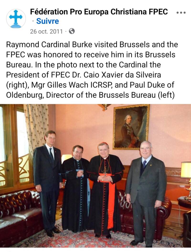 Ci-dessous: Le cardinal Burke et Mgr Wach (Institut du Christ roi souverain prêtre) en visite à la Fédération Pro Europa Christiana de Bruxelles.