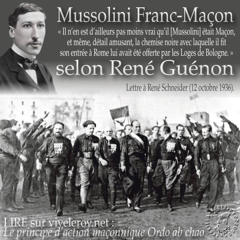 Dans sa lettre du 12 octobre 1936 à R. Schneider, René Guénon écrit que Mussolini appartenait lui-même à la franc-maçonnerie: