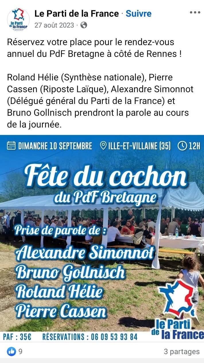 Ci-dessous: La page facebook officielle du PDF annonce la présence de Roland Hélie à l'occasion de sa fête annuelle du cochon.