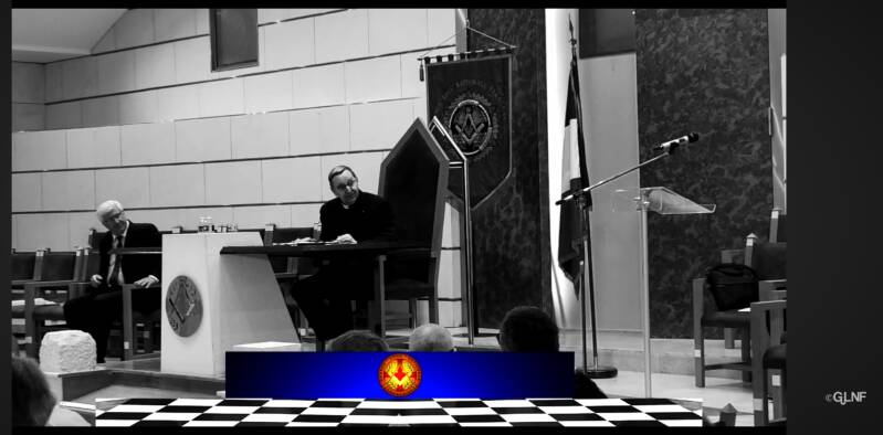 Ci-dessous : le Père Viot en conférence à la loge Villard de Honnecourt [1]. Celle-ci s'est tenue en 2019, en présence de Jean-Pierre Rollet, Grand Maître de la Grande Loge Nationale de France (GLNF).