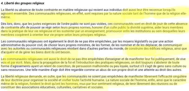 Ci-dessous, le chapitre 4 de Dignitatis humanae nous indique que les individus des différentes communautés religieuses doivent avoir le droit: